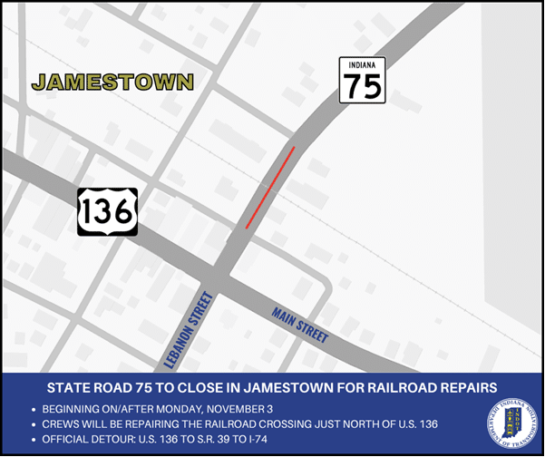 Beginning on or after Monday, November 3, CSX Transportation will close the crossing on S.R. 75 just north of U.S. 136 for repairs. Work is anticipated to last until the end of the week but is weather-dependent and subject to change. The official detour around the closure is U.S. 136 to S.R. 39 to I-74.
